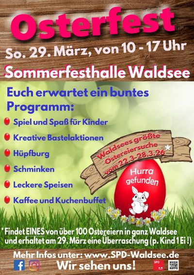Der SPD-Ortsverein Waldsee lädt euch am 29. März 2026 ganz herzlich zum großen SPD-Osterfest in die Sommerfesthalle ein – und wir versprechen: Es wird bunt, wild und garantiert kalorienreich.